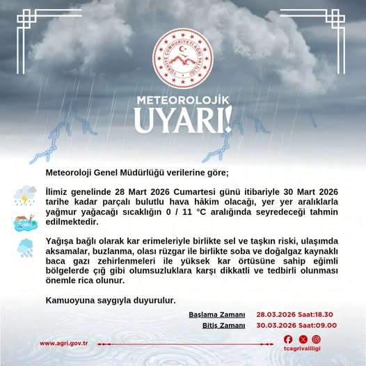 Ağrı Valiliği, il genelinde beklenen meteorolojik şartlarla ilgili önemli bir duyuru yayımladı. Yapılan son değerlendirmelere göre, 28 Mart 2026 Cumartesi akşamından itibaren başlayacak olan yağışlı havanın 30 Mart tarihine kadar aralıklarla devam etmesi bekleniyor.