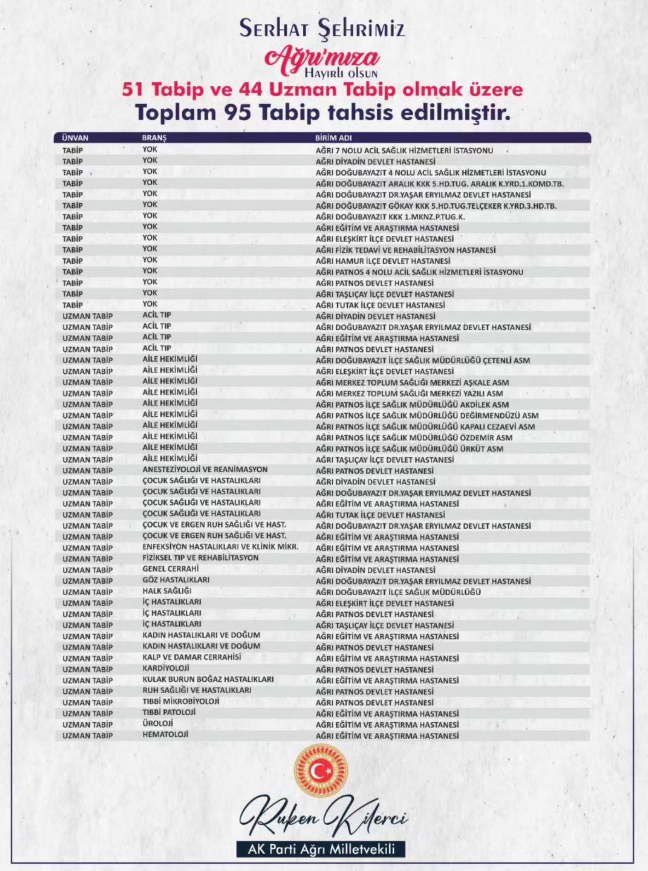 AK Parti Ağrı Milletvekili Ruken Kilerci, müjdeyi sosyal medya hesaplarından duyurdu: Ağrı’ya 127. Dönem DHY kapsamında 95 doktor ataması yapılıyor.