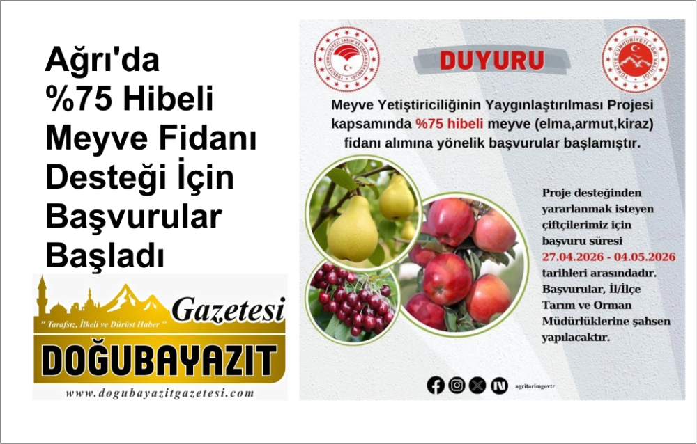 Ağrı’da çiftçilere yönelik önemli bir destek daha hayata geçirildi. Tarım ve Orman Müdürlüğü tarafından yapılan duyuruya göre, “Meyve Yetiştiriciliğinin Yaygınlaştırılması Projesi” kapsamında elma, armut ve kiraz fidanı alımına yönelik %75 hibeli destek için başvurular başladı.