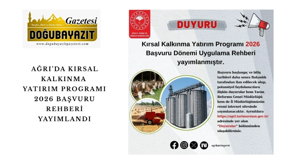 Ağrı İl Tarım ve Orman Müdürlüğü, Kırsal Kalkınma Yatırım Programı 2026 kapsamında önemli bir duyuru yaptı. Müdürlük tarafından yapılan açıklamaya göre, programın Başvuru Dönemi Uygulama Rehberi resmen yayımlandı.
