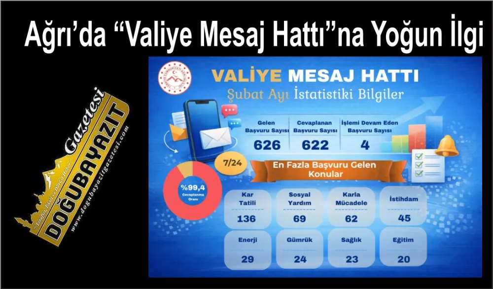 Valilikten yapılan açıklamaya göre, hattın hizmete girdiği 2 Şubat ile 28 Şubat tarihleri arasında toplam 626 vatandaş talep ve görüşlerini doğrudan iletti. Vatandaş odaklı hizmet anlayışının bir ürünü olan bu uygulama, Ağrılılar tarafından büyük bir memnuniyetle karşılandı.