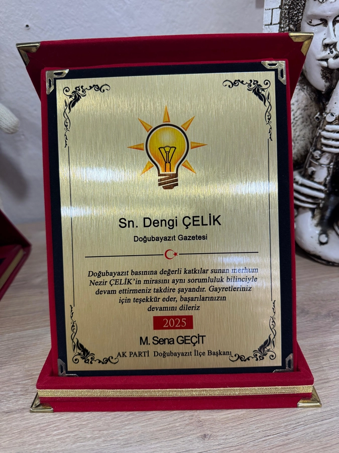 Sayın Geçit, merhum babam Nezir Çelik’in Doğubayazıt basınına yaptığı hizmetleri vurgulayarak, aynı sorumluluk bilinciyle gazetecilik görevini sürdürmemizi takdirle karşıladıklarını ifade etti. Bu anlamlı plaket, hem babamın hatırasını yaşatma yolunda atılan değerli bir adım, hem de gazetemizin Doğubayazıt’a sunduğu katkıların onurlandırılması açısından büyük bir önem taşımaktadır.