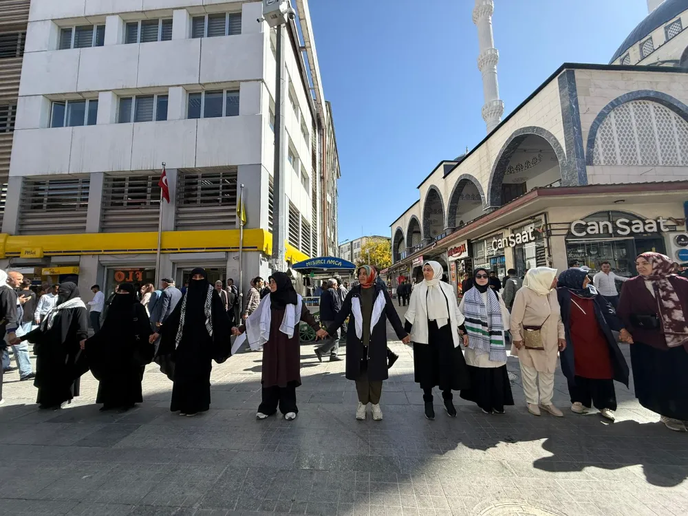 Açıklamada, “Bu zincir; Gazze’de evlatlarını kaybeden annelerin, yetim kalan çocukların ve insanlığını kaybetmeyen herkesin zinciridir” denildi.