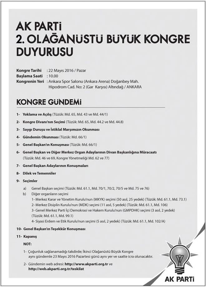 AKP´nin 22 Mayıs´ta yapılması kararlaştırılan ikinci olağanüstü büyük kongresine ilişkin duyuruya, partinin internet sitesinde yer verildi.