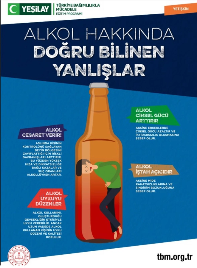 Türkiye Yeşilay Cemiyeti tarafından yürütülen “Türkiye Bağımlılıkla Mücadele Eğitim Programı” kapsamında hazırlanan bilgilendirme çalışmasında, alkolle ilgili toplumda yaygın olarak doğru sanılan yanlışlara dikkat çekildi. Özellikle yetişkinlere yönelik hazırlanan içerikte, alkol kullanımının etkilerine dair önemli uyarılar yer aldı.