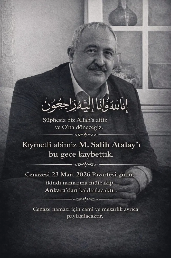 Merhum Hacı Salih Atalay’ın cenazesi, 23 Mart 2026 Pazartesi günü ikindi namazına müteakip Ankara’da kılınacak cenaze namazının ardından son yolculuğuna uğurlanacaktır.