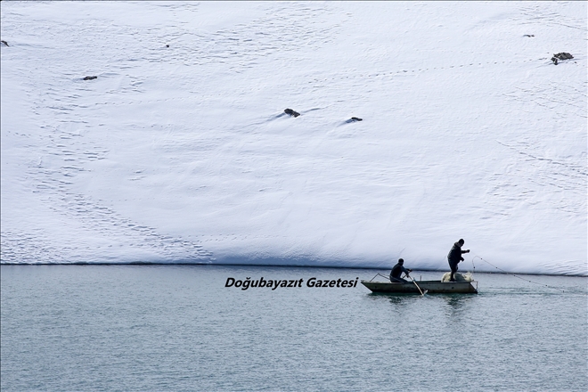 Baharla birlikte gölün buz tabakası eriyen kısımlarında avlanan balıkçılar, yakaladıkları sazan ve alabalıkları satarak geçimlerini sağlıyor.