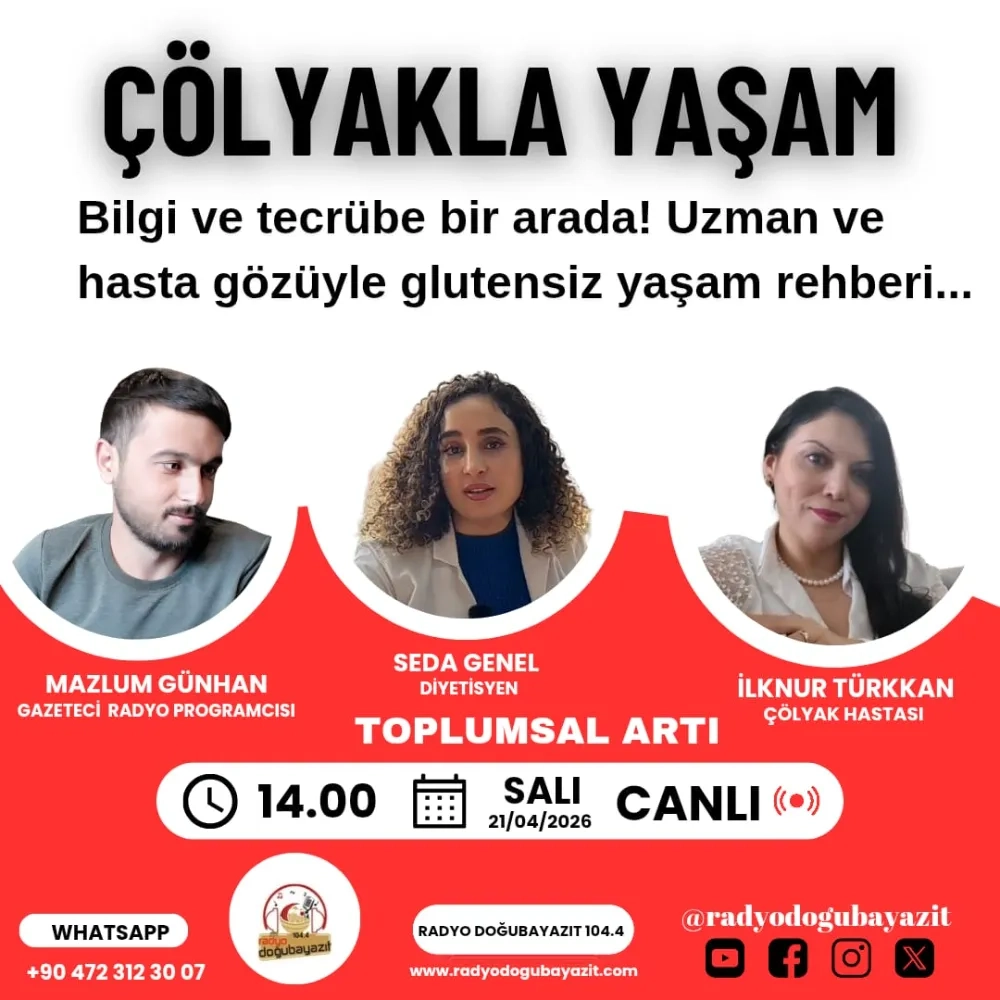 Doğubayazıt’ta çölyak hastalığına dikkat çekmek ve toplumsal farkındalık oluşturmak amacıyla önemli bir program düzenleniyor. Radyo Doğubayazıt 104.4’te yayınlanan “Toplumsal Artı” programında, “Çölyakla Yaşam” konusu uzman ve hasta deneyimleriyle ele alınacak.