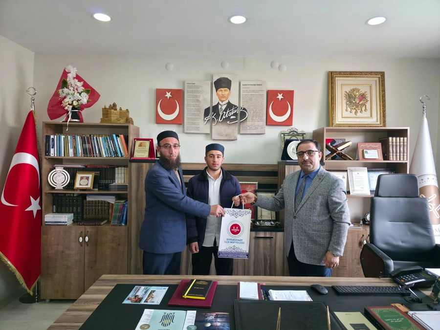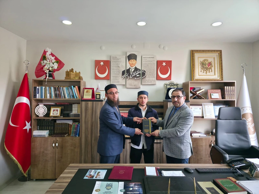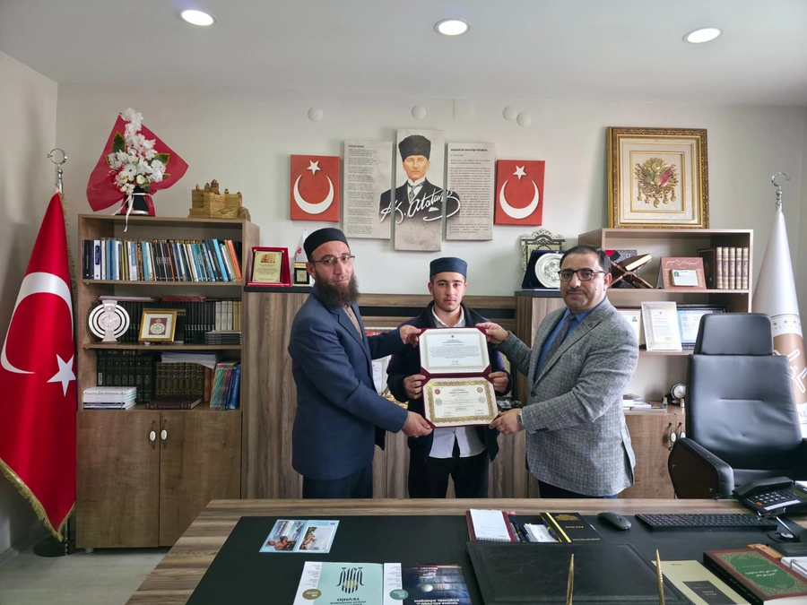 İlçe Müftüsü İsa Demirkaynak, makamında kabul ettiği Emir Kılıç’ı tebrik ederek hafızlık belgesini takdim etti. Ziyarette, eğitim sürecinde büyük emeği bulunan hocası Faruk Arvasi de yer aldı.