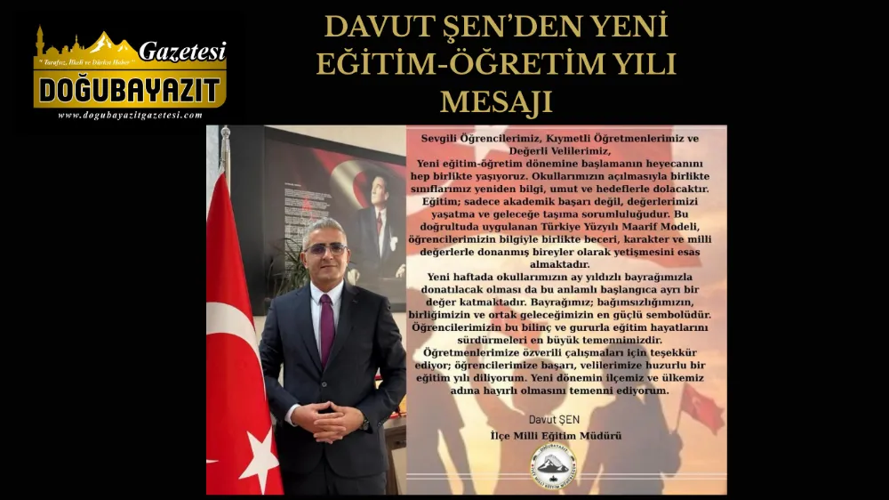Doğubayazıt İlçe Milli Eğitim Müdürü Davut Şen, yeni eğitim-öğretim döneminin başlaması dolayısıyla öğrenci, öğretmen ve velilere hitaben bir mesaj yayımladı.