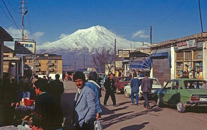 90’lı yıllarda çekilen fotoğrafta, Doğubayazıt çarşısının mütevazı dükkanları ve o dönemin simgesi eski model araçlar arasında hayat akarken, arka planda tüm heybetiyle duran Ağrı Dağı şehrin gerçek sahibi gibi görünüyor. Tabelalardaki sadelik, insanların kıyafetlerindeki o eski Anadolu dokusu ve en önemlisi şehrin nefes aldığı geniş boşluklar, Grumpe’nin karesinde ölümsüzleşmişti.