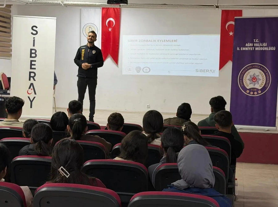 Doğubayazıt Yunus Emre Anadolu Lisesi’nde düzenlenen programda yaklaşık 700 öğrenciye yönelik bilgilendirme çalışması yapıldı. Eğitimlerde, özellikle gençlerin dijital dünyada karşılaşabileceği risklere dikkat çekilerek bilinçli internet kullanımı konusunda önemli bilgiler paylaşıldı.