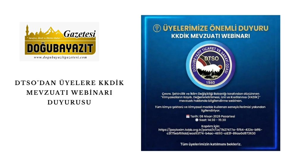 Doğubayazıt Ticaret ve Sanayi Odası, üyelerine yönelik önemli bir bilgilendirme toplantısı düzenliyor. Oda tarafından yapılan duyuruda, kimyasal sektörünü yakından ilgilendiren “Kimyasalların Kaydı, Değerlendirilmesi, İzni ve Kısıtlanması (KKDİK)” mevzuatı hakkında webinar gerçekleştirileceği bildirildi.