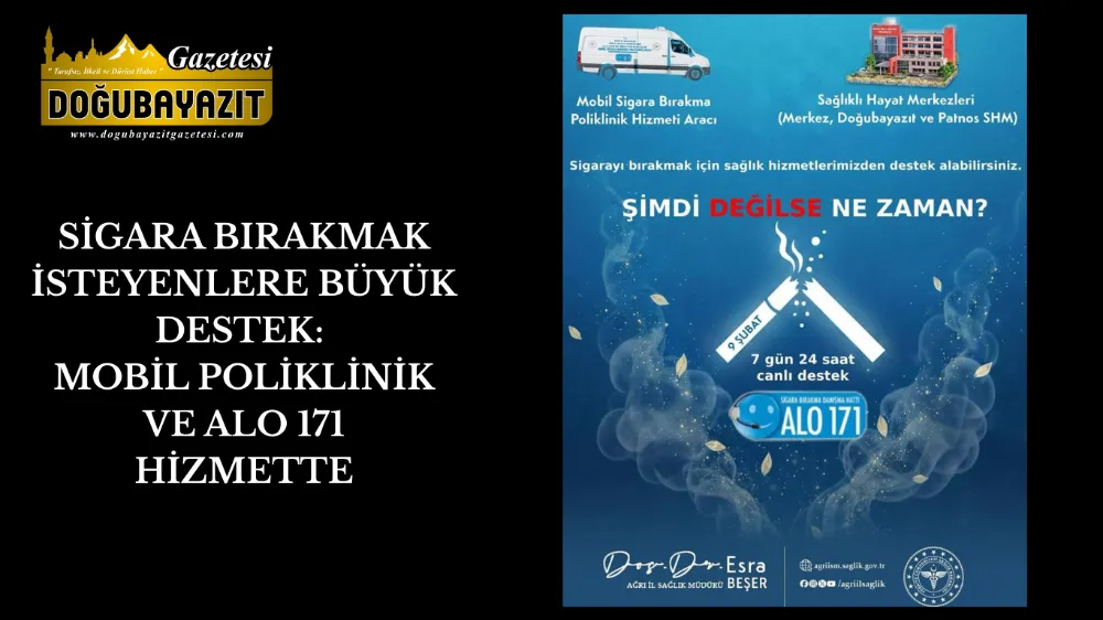 Doğubayazıt İlçe Sağlık Müdürlüğü tarafından yapılan bilgilendirme paylaşımında, sigarayı bırakmak isteyen vatandaşlara yönelik sunulan sağlık hizmetlerine dikkat çekildi. Paylaşımda, Mobil Sigara Bırakma Poliklinik Hizmeti Aracı ile Sağlıklı Hayat Merkezleri’nin (Merkez, Doğubayazıt ve Patnos) aktif olarak hizmet verdiği vurgulandı.