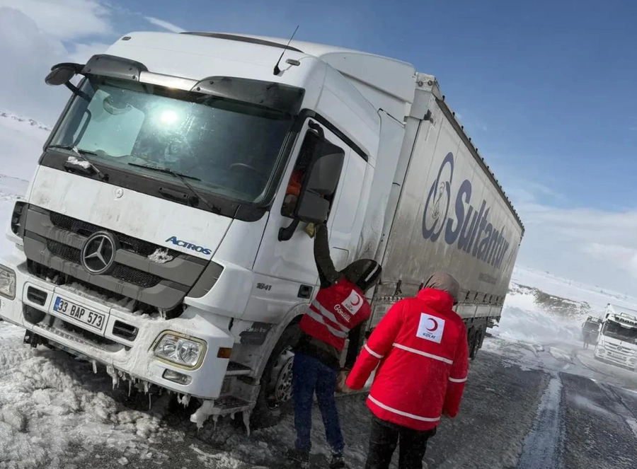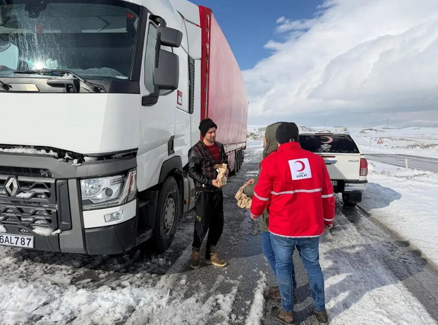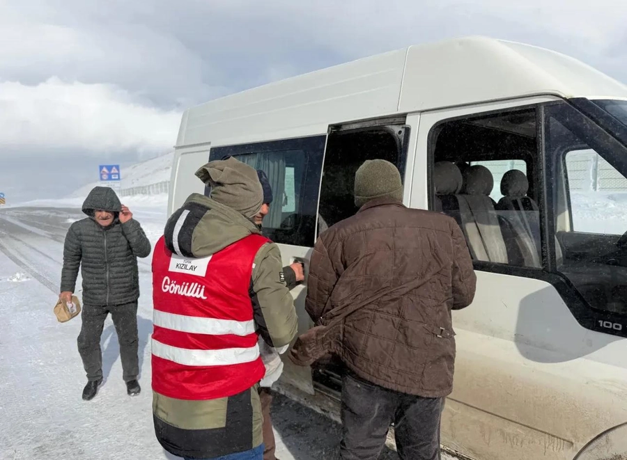 Ağrı Doğubayazıt ile Van’ın Çaldıran ilçesi arasındaki Tendürek Geçidi’nde yoğun kar yağışı ve tipi nedeniyle yolun kapanmasının ardından bölgede beklemek zorunda kalan vatandaşlara Kızılay ekipleri tarafından kumanya desteği sağlandı.