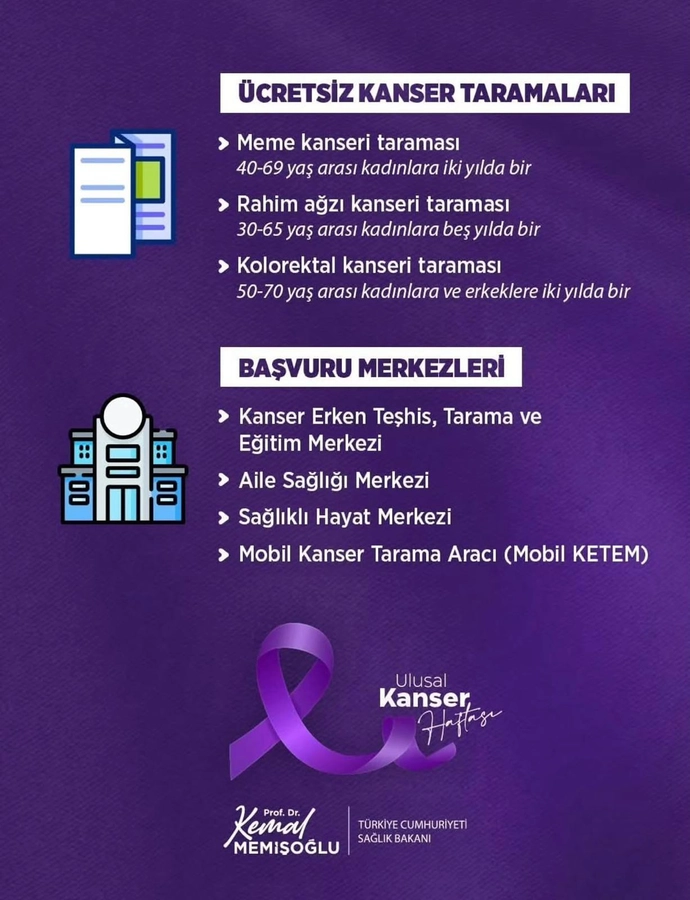 Yapılan açıklamada, kanserde erken teşhisin hayati önem taşıdığı vurgulanarak, belirli yaş gruplarına yönelik ücretsiz tarama hizmetlerinin devam ettiği belirtildi. Bu kapsamda; 40-69 yaş arası kadınlara iki yılda bir meme kanseri taraması, 30-65 yaş arası kadınlara beş yılda bir rahim ağzı kanseri taraması ve 50-70 yaş arası kadın ve erkeklere iki yılda bir kolorektal kanser taraması yapıldığı ifade edildi.