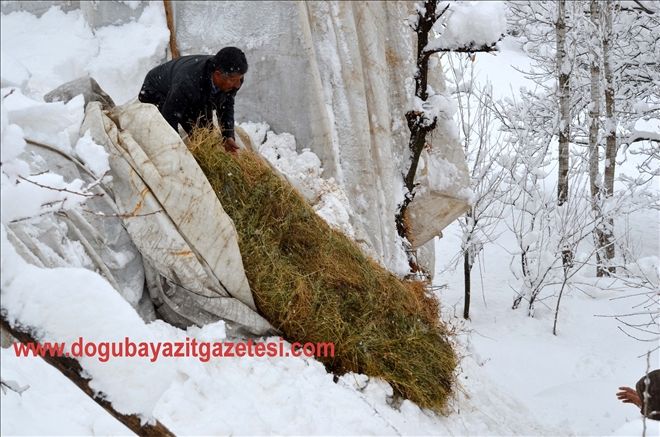 Yüksek kar örtüsünü ezerek getirdikleri yemlerle hayvanlarını besleyen köylüler, zorlu kış şartlarına aldırış etmeden hayvanların tüm ihtiyaçlarını karşılıyor.