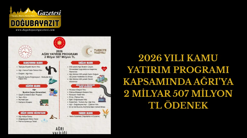 15 Ocak 2026 tarihli ve 33138 (Mükerrer) sayılı Resmî Gazete’de yayımlanan Cumhurbaşkanlığı Kararı ile kabul edilen 2026 Yılı Kamu Yatırım Programı kapsamında Ağrı’ya 23 proje için toplam 2 milyar 507 milyon TL ödenek tahsis edildi.