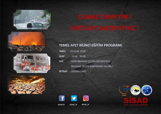 Ağrı İl Afet ve Acil Durum Müdürlüğü (AFAD), Sivil Savunma Derneği (SİSAD) ve Ağrı Eğitim Çevre Gençlik ve Spor Kulübü (AĞÇED) 9 Ocak 2018 tarihinde saat 10.00´da Ağrı İbrahim Çeçen Üniversitesi, Nezehat Çeçen Konferans Salonunda ?Temel Afet Bilinci Eğitimi? programı düzenleyecektir.