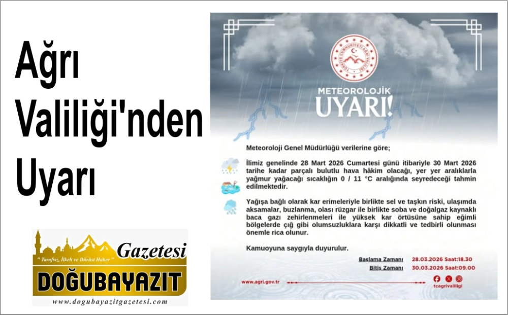 Ağrı Valiliği, il genelinde beklenen meteorolojik şartlarla ilgili önemli bir duyuru yayımladı. Yapılan son değerlendirmelere göre, 28 Mart 2026 Cumartesi akşamından itibaren başlayacak olan yağışlı havanın 30 Mart tarihine kadar aralıklarla devam etmesi bekleniyor.