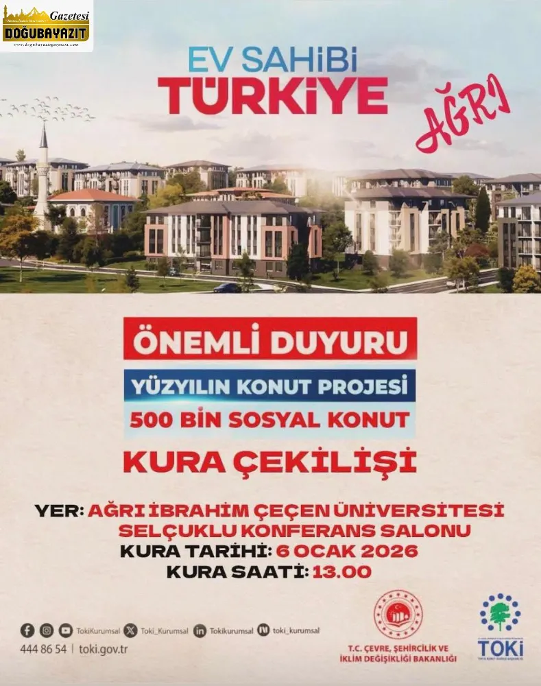 Toplu Konut İdaresi Başkanlığı (TOKİ) tarafından yürütülen 500 bin sosyal konut projesi kapsamında Ağrı’da gerçekleştirilecek kura çekiminin tarihi ve saati netleşti.