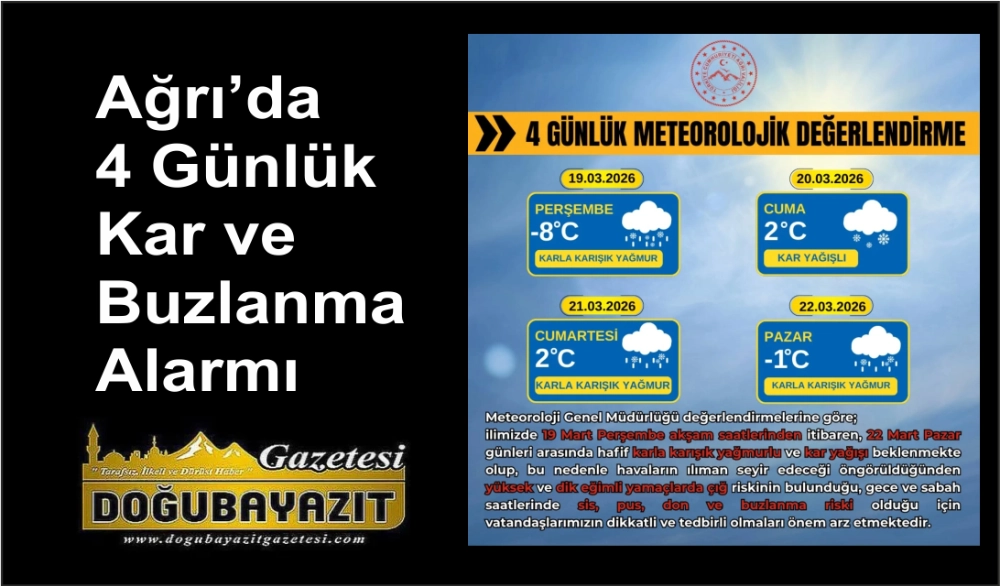 Yapılan meteorolojik değerlendirmelere göre; 19 Mart 2026 Perşembe günü akşam saatlerinden itibaren, 22 Mart Pazar gününe kadar Ağrı genelinde aralıklarla karla karışık yağmur ve kar yağışı görüleceği tahmin ediliyor.