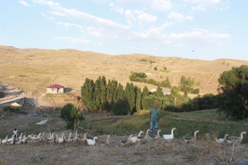Kendi imkanlarıyla evin önünde bulunan tarlaların etrafını tel örgülerle kapatarak çiftliğe dönüştüren Aldemir, 1 yıl önce kaz alarak kurduğu çiftliği büyüterek kazların yanı sıra ördek ve tavukta beslemeye başladı.