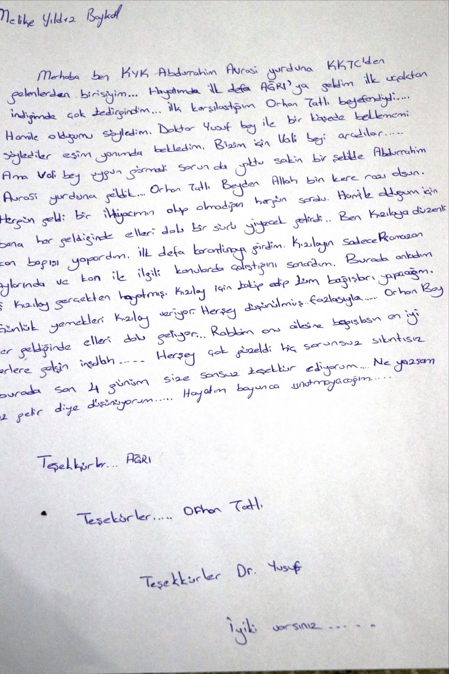 Yurtlarda kalan hamile kadın Melike Yıldız Baykal da mektubunda, Kızılay Ağrı Şube Başkanı Orhan Tatlı'nın kendilerine çok yardımcı odluğunu anlattı.
