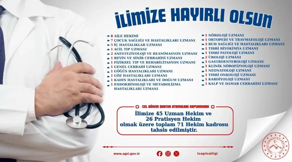 45 uzman hekim ve 26 pratisyen hekim olmak üzere toplam 71 hekim kadrosu Ağrı’ya kazandırıldı.