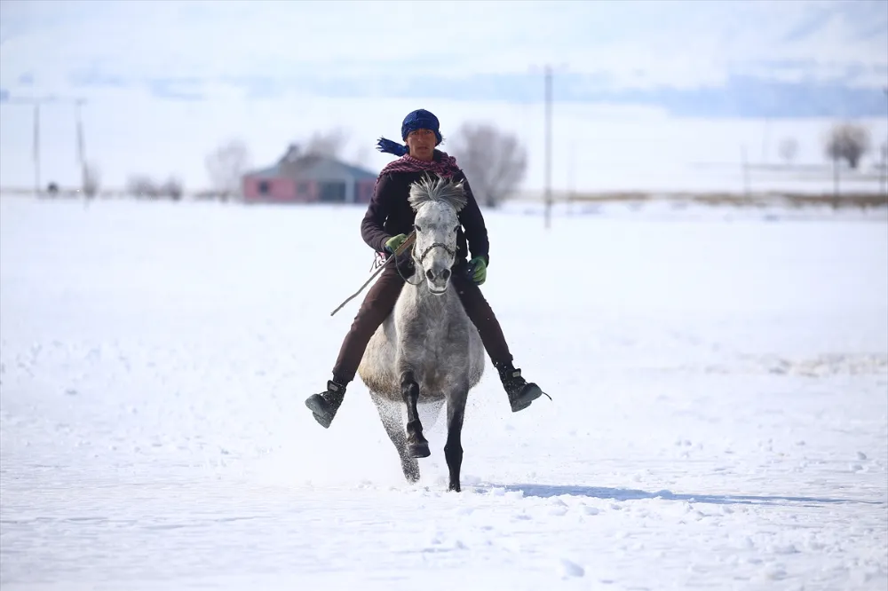 Beyaz örtüyle kaplı arazide at binen ve dört nala ilerleyen gençler, sert ve karlı zeminde hayvanlarının sakatlanmamasına da özen gösteriyor.