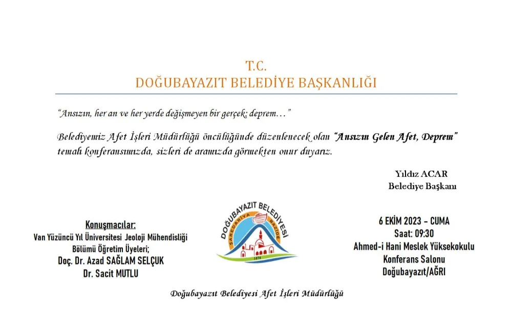 Doğubayazıt Belediyesi Afet İşleri Müdürlüğü “Ansızın Gelen Afet, Deprem” temalı bir konferans düzenleyecek.