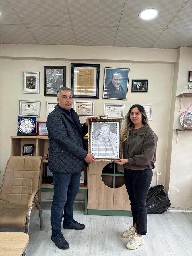 Bugün ise bambaşka bir anlam taşıyan bir ziyaret yaşadık. Babamın değer verdiği dostlarından, Ercan Emengen abimiz gazetemize geldi. Elinde öyle bir hediye vardı ki… Sözle anlatması zor. Babamın kara kalemle çizilmiş bir portresi. Sanki bir fotoğraf değil de, anıların içinden süzülüp gelmiş bir yüz… O an, sadece bir resim değil; emek, vefa ve hatıraların birleştiği bir tabloya baktık.