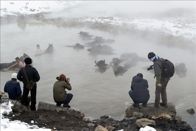 Türkiye´nin dört bir yanından bölgeye akın eden fotoğrafçılar, kış aylarında 40 sıcaklıktaki kaplıcaya manda ve atlarıyla giren çocukları görüntülüyor.