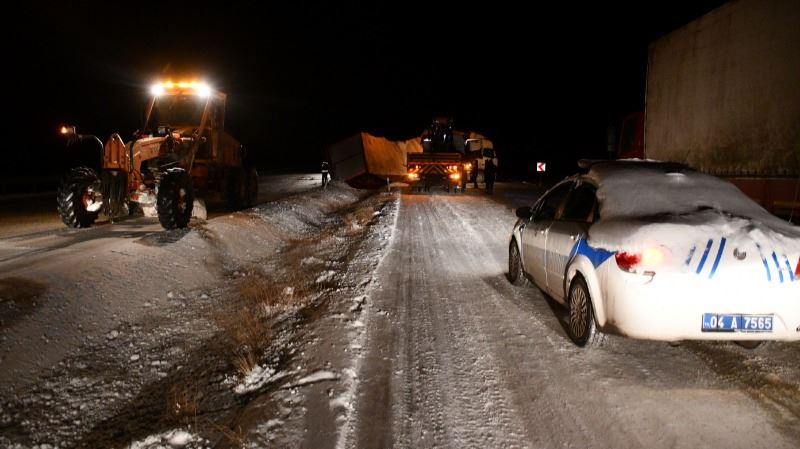 İran yönüne giden yabancı plakalı tır, buzlanmanın etkili olduğu Diyadin ile Doğubayazıt ilçeleri arasındaki Büvetli köyü yakınlarında karşı şeride geçerek devrildi.