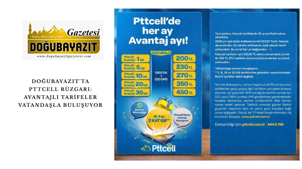 Doğubayazıt’ta PTT bünyesinde sunulan Pttcell tarifeleri, her geçen gün daha fazla vatandaşın ilgisini çekmeye devam ediyor. “Her ay avantaj ayı” sloganıyla duyurulan kampanya kapsamında, farklı ihtiyaçlara hitap eden uygun fiyatlı tarifeler vatandaşlara sunulurken, özellikle ekonomik seçenekler dikkat çekiyor.