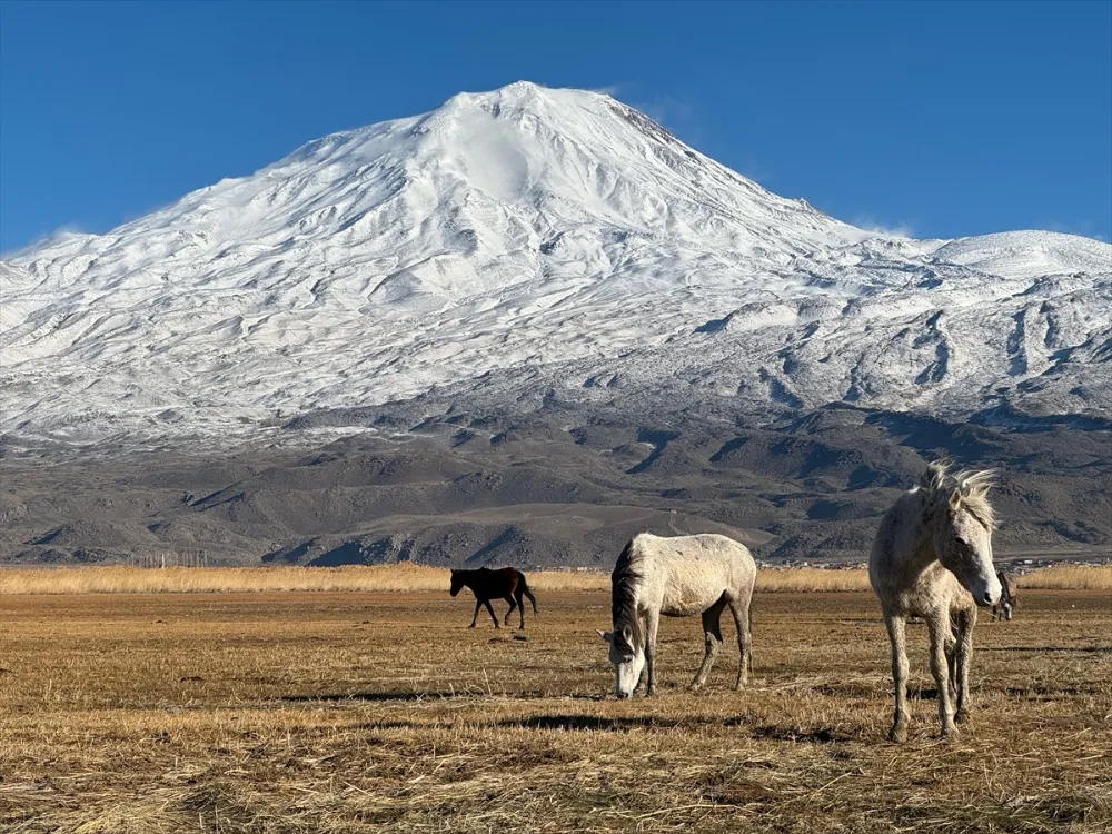 Zirvesindeki buzulların üzerine kar yağan Doğubayazıt Ağrı Dağı, karla kaplanan görüntüsüyle dikkati çekiyor.