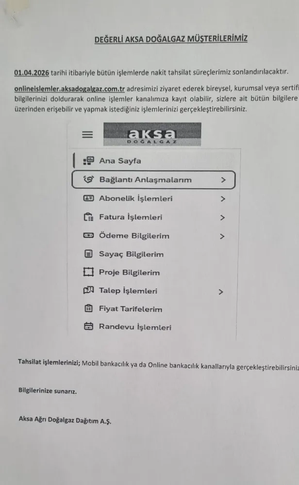 Doğubayazıt'ta ısınma ihtiyacının temel kaynağı olan doğalgazda, ödeme yöntemlerine ilişkin flaş bir gelişme yaşandı. Aksa Ağrı Doğalgaz Dağıtım A.Ş. tarafından yapılan duyuruya göre, 1 Nisan 2026 tarihinden itibaren tüm fiziksel şubelerde nakit tahsilat işlemleri tamamen sona erdirilecek.