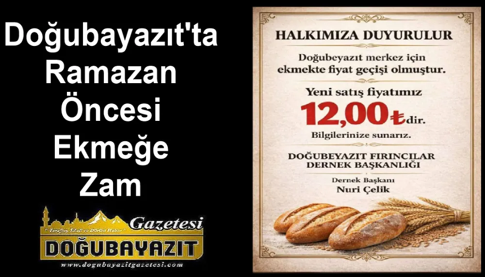 "Halkımıza duyurulur; Doğubayazıt merkez için ekmekte fiyat geçişi olmuştur. Yeni satış fiyatımız 12,00 ₺'dir. Bilgilerinize sunarız."