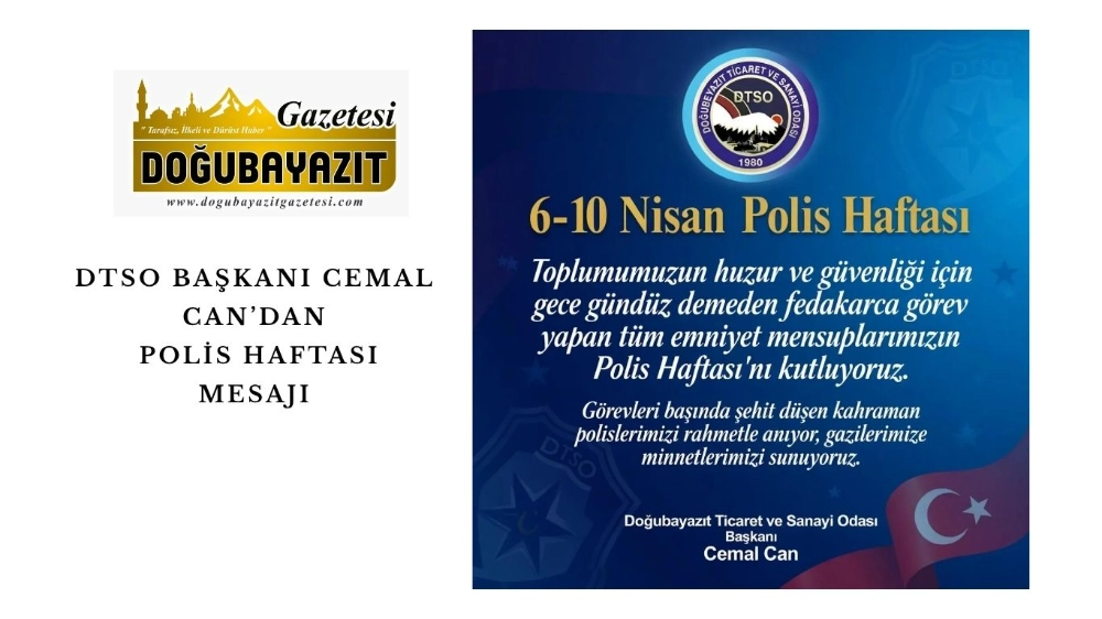 Doğubayazıt Ticaret ve Sanayi Odası Başkanı Cemal Can, 6-10 Nisan Polis Haftası dolayısıyla yayımladığı mesajda, emniyet teşkilatının toplumun huzur ve güvenliği için üstlendiği hayati göreve dikkat çekti. Başkan Cemal Can, gece gündüz demeden fedakârca görev yapan tüm emniyet mensuplarının Polis Haftası’nı kutladığını belirtti.