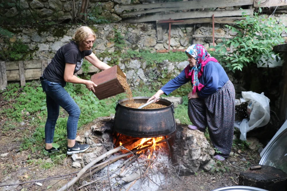 Kurutma işlemi sonrası kadınlar tarafından yaprak ve saplarından ayrılan dutlar, odun ateşinde yakılan kazanlara doldurulup, pişirme ve süzme işlemleriyle pekmez haline getiriliyor.