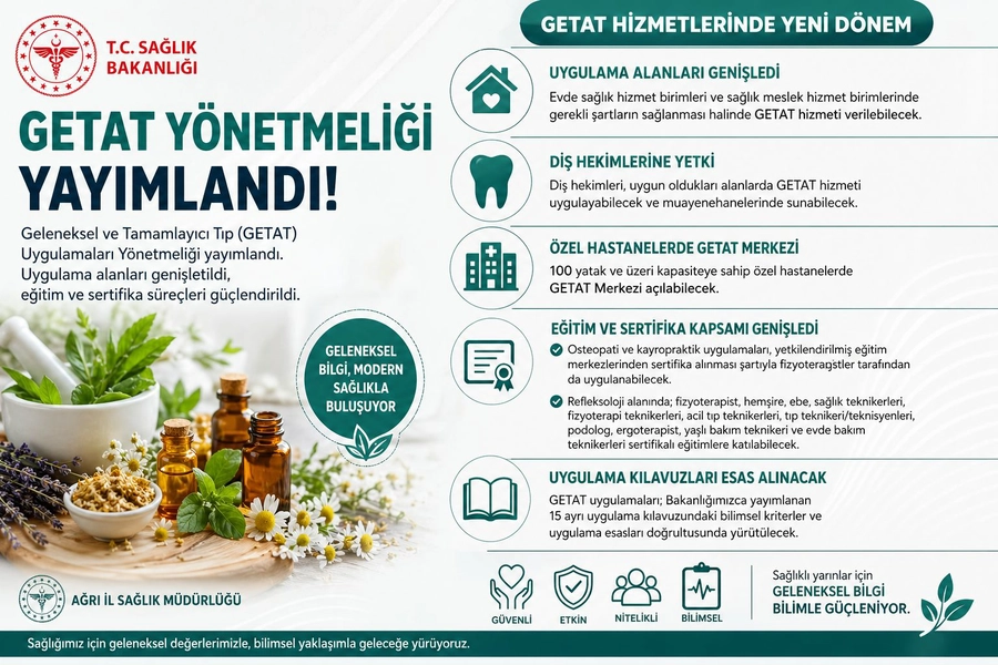 Ağrı İl Sağlık Müdürlüğü tarafından paylaşılan bilgilere göre, Sağlık Bakanlığı tarafından hazırlanan “Geleneksel ve Tamamlayıcı Tıp (GETAT) Uygulamaları Yönetmeliği” yayımlandı. Yeni düzenlemeyle birlikte GETAT hizmetlerinin kapsamı genişletilirken, uygulama alanları ve eğitim süreçlerine yönelik önemli değişiklikler getirildi.