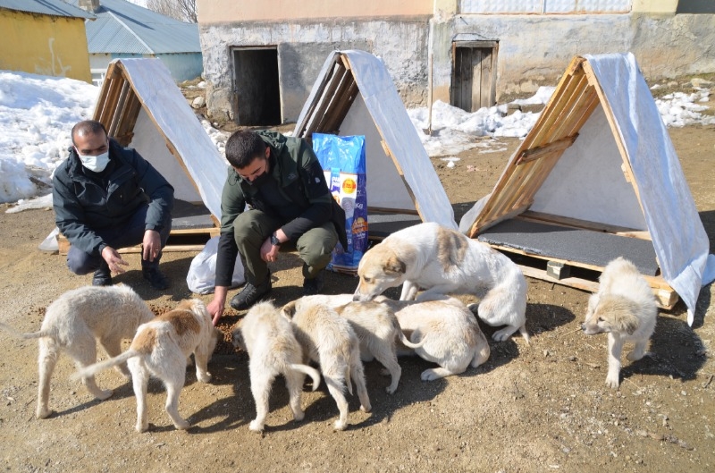 Barınakları sokak hayvanlarının yoğun bulunduğu noktalara yerleştiren dernek üyeleri, hayvanlara da mama verdi.