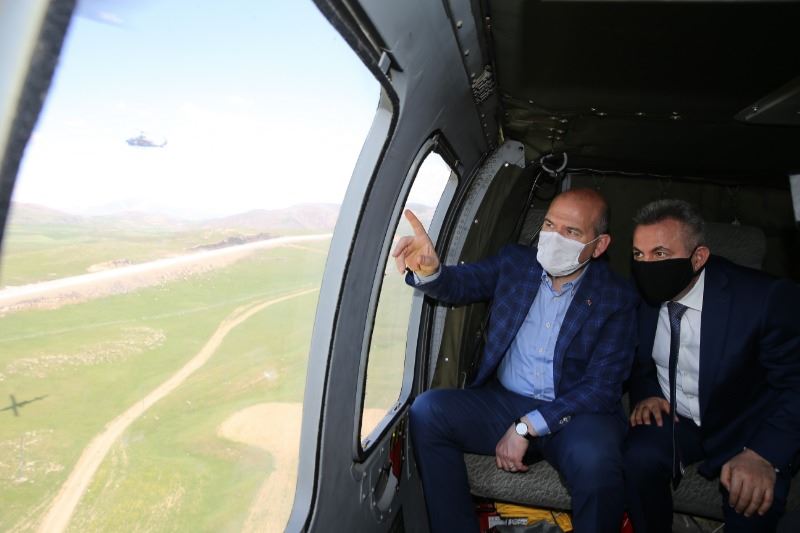 Bakan Soylu, Vali Süleyman Elban, Emniyet Genel Müdür Yardımcısı İbrahim Kulular, Jandarma Asayiş Başkanı Tümgeneral Fuat Güney, İller İdaresi Sınır Duvarlarından Sorumlu Daire Başkanı Mehmet Yüzer, AK Parti Ağrı Milletvekili Ekrem Çelebi, Ağrı Belediye Başkanı Savcı Sayan, Erzurum Jandarma Bölge Komutanı Tuğgeneral Semih Okyar'ın da iştirakiyle helikopterle Türkiye-İran sınırında incelemelerde bulundu.