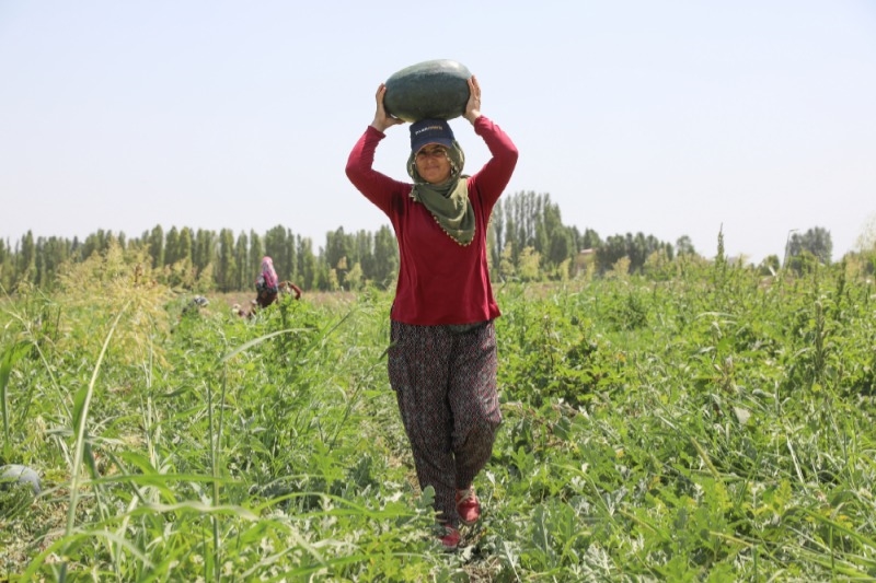 Yaklaşık 8 bin dekar alanda üretilen karpuzların toplanması için mevsimlik işçiler, tarlalarda yoğun mesai yapıyor.
