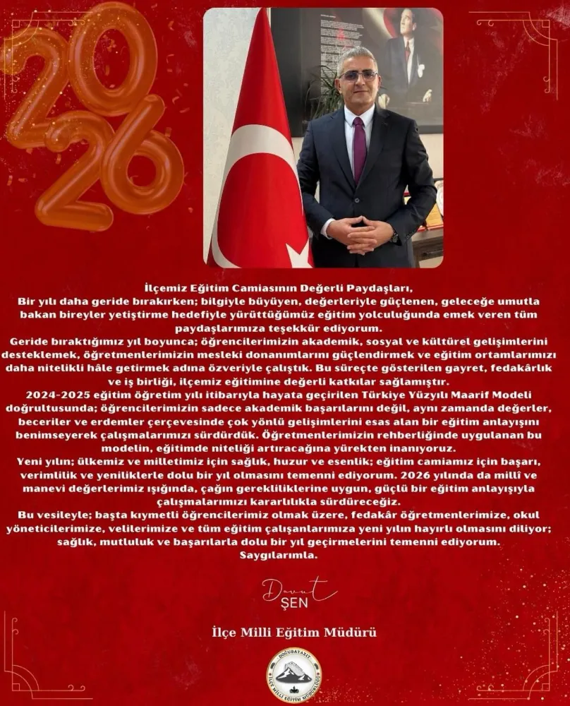 Doğubayazıt İlçe Milli Eğitim Müdürü Davut Şen, 2026 yılı dolayısıyla yayımladığı yeni yıl mesajında eğitim camiasına hitap ederek, geride bırakılan yılın değerlendirmesini yaptı ve yeni yıla dair temennilerini paylaştı.