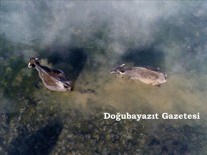 Hava sıcaklığının kış mevsiminde sıfırın altında 40 dereceye kadar düştüğü ilçede yaşayan besiciler, ilçe merkezine 7 kilometre uzaklıktaki Kaz Gölü Çayı´na getirdikleri hayvanlarının suyun altındaki otlarla karınlarını doyurmasını sağlıyor.