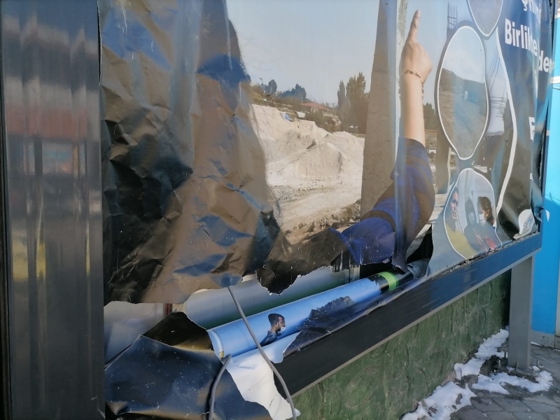 Daha önceki günlerde yaşanan saldırılarla yetinmeyenler şimdide şehrin tanıtımını yapan billboardları hedef alarak camlarını yerle yeksan ettiler.