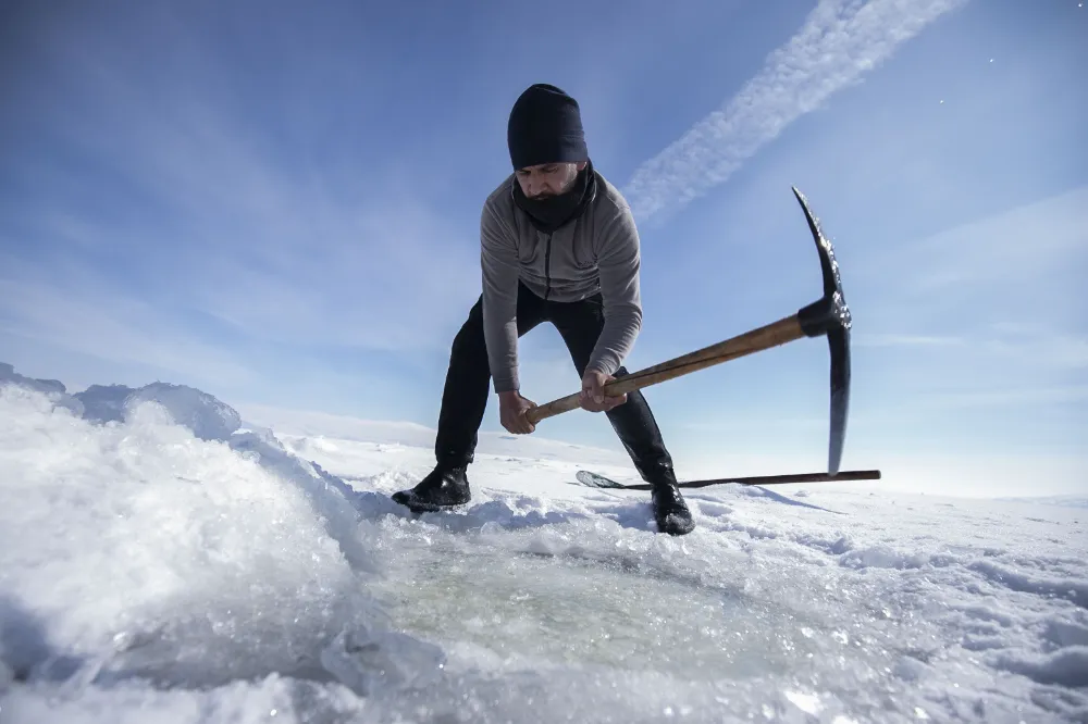Zorlu koşullarda avlanmaya çalışan balıkçılar, her gün gölün üzerine çıkarak buzu deliyor ve balıkları yakalamak için büyük emek harcıyor.